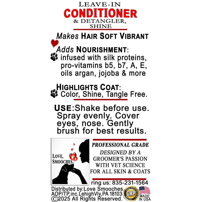 Love Smooches Leave-in Conditioner -- Detangler & Shine Enhancer -- (roughly 6 applications *based on weekly baths)... Makes Hair Soft & Vibrant ... Adds Nourishment (infused silk proteins, ProV b5, b7, A E, 1 or more of oils: argan jojoba & more) .... Highlights Coat (color brightness, healthy shine, Tangle free) -- Designed by a Groomers Passion, Vet Science, Breeder & Show Ring Champion Handlers